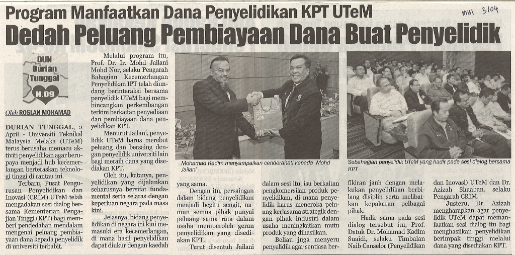 Program manfaatkan Dana Penyelidikan KPT UTeM Dedah Peluang Pembiayaan Dana Buat Penyelidik