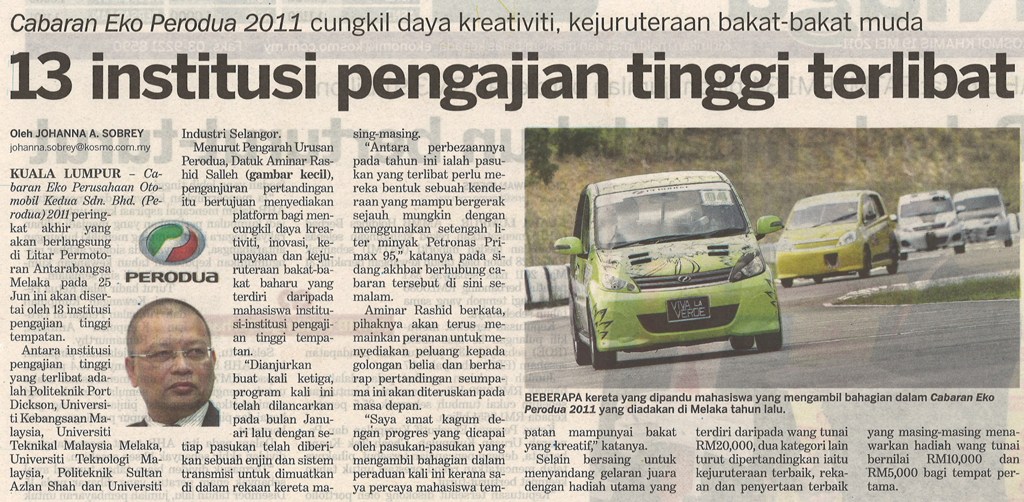 Cabaran Eko Perodua 2011 cungkil daya kreativiti,kejuruteraan bakat-bakat muda 13 institusi pengajian tinggi terlibat