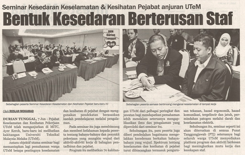 Seminar Kesedaran Keselamatan & Kesihatan Pejabat anjuran UTeM Bentuk Kesedaran Berterusan Staf