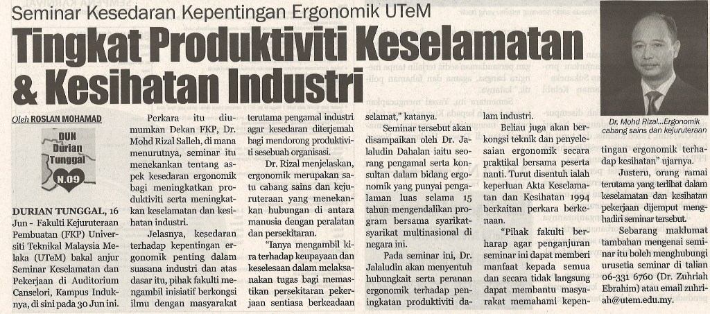 Seminar Kesedaran Kepentingan Ergonomik UTeM Tingkat Produktiviti Keselamatan dan Kesihatan Industri