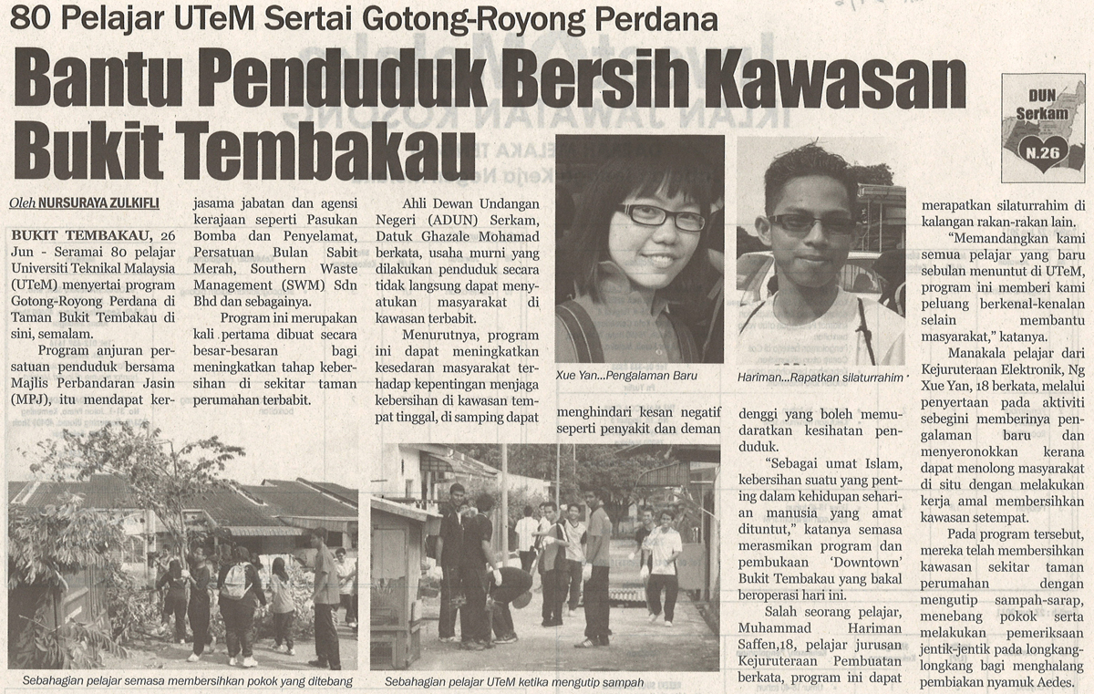 80 pelajar UTem bantu penduduk bersih kawasan Bukit Tembakau