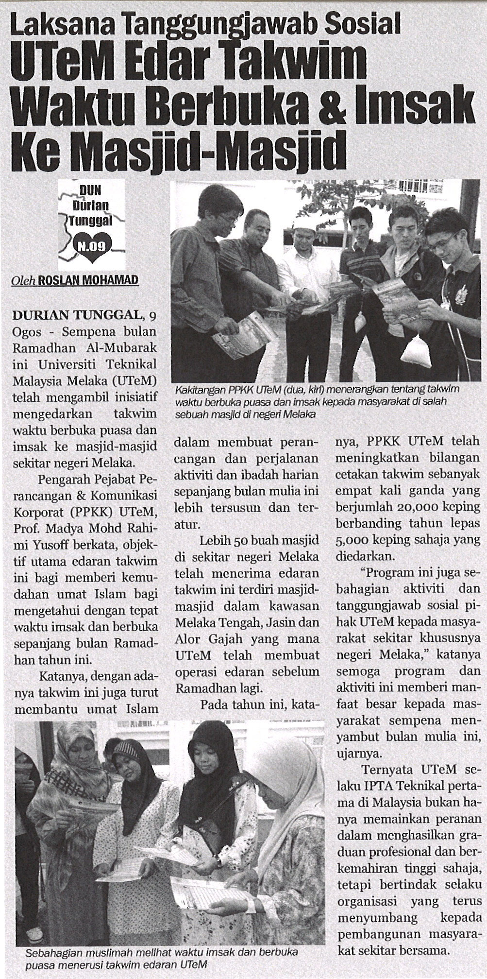 Laksana Tanggungjawab Sosial, UTeM edar takwim waktu berbuka & imsak ke masjid-masjid