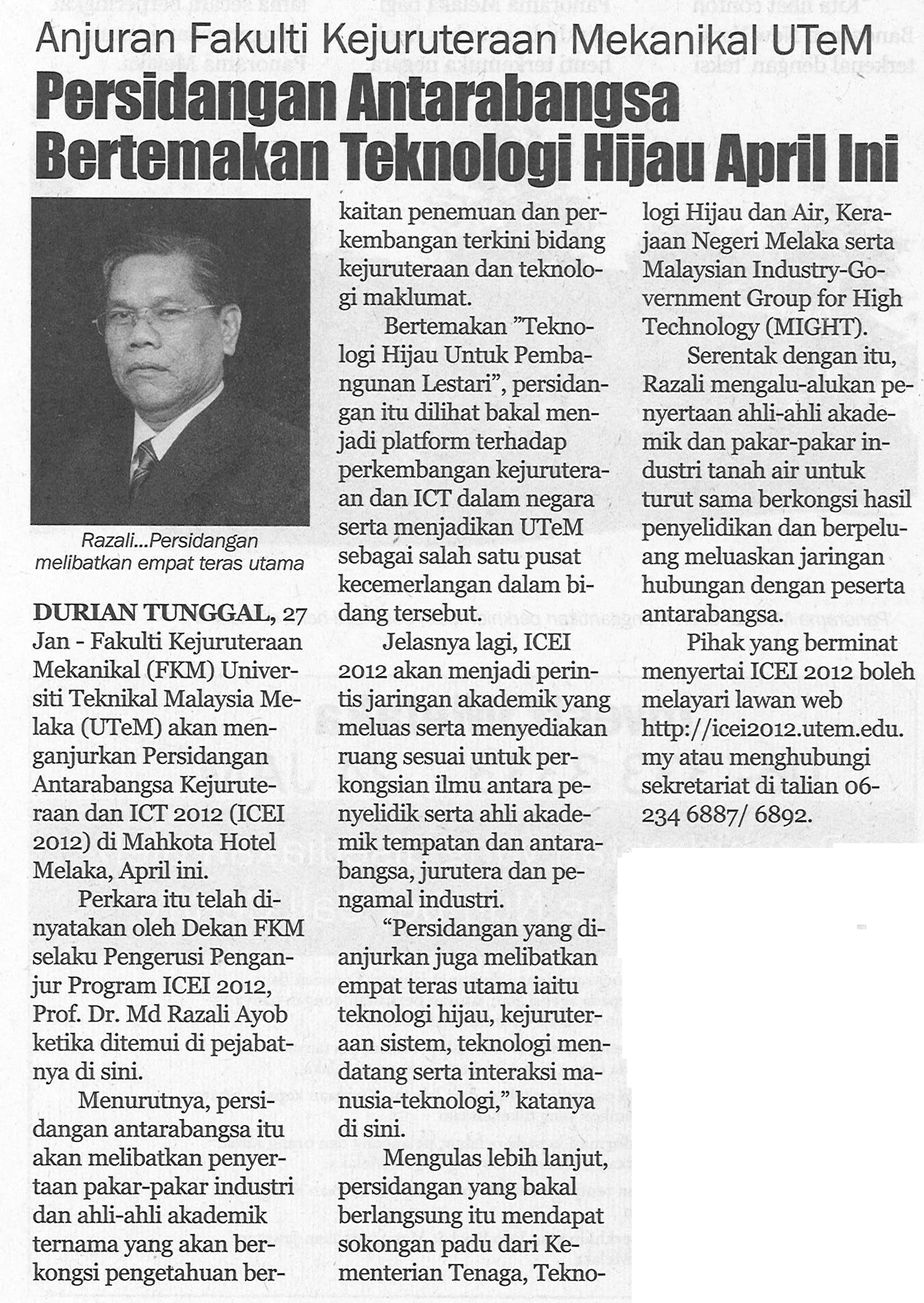 Anjuran Fakulti Kejuruteraan Mekanikal UTeM, Persidangan Antarabangsa Bertemakan Teknologi Hijau April Ini