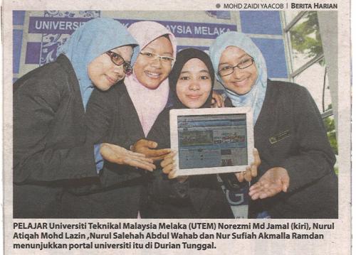 Pelajar Universiti Teknikal Malaysia Melaka (UTeM) Norezmi Md Jamal (kiri),Nurul Atiqah Mohd Lazin,Nurul Salehah Abdul Wahab dan Nur Sufiah Akmalla Ramdan menunjukkan portal universiti itu di Durian Tunggal