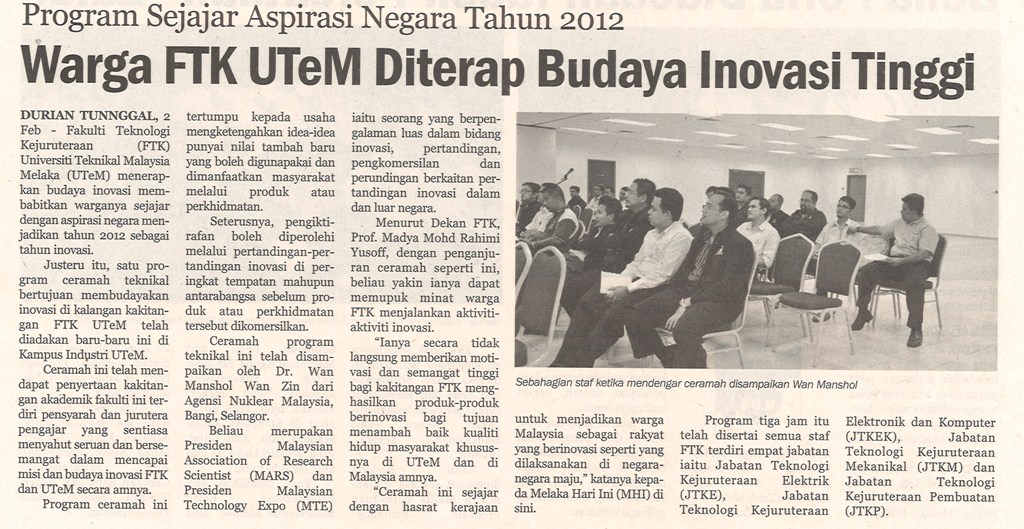 Program Sejajar Aspirasi Negara Tahun 2012 Warga FTK UTeM Diterap Budaya Inovasi Tinggi