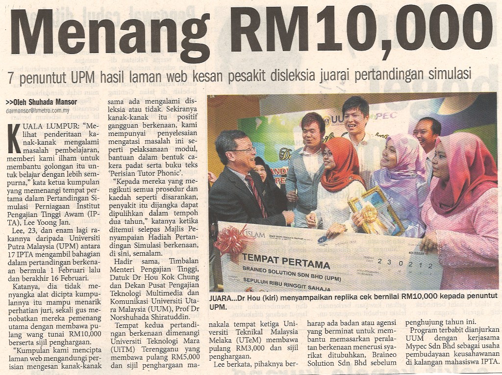 Menang RM10,000 7 penuntut UPM hasil laman web kesan pesakit disleksia juarai pertandingan simulasi
