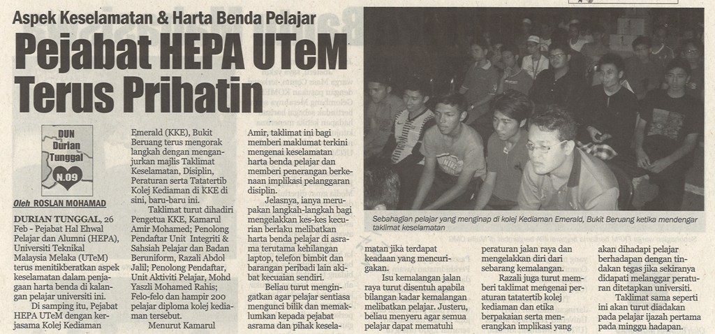 Aspek Keselamatan & Harta Benda Pelajar Pejabat HEPA UTeM Terus Prihatin