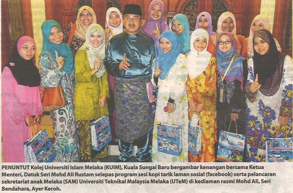 : | Berita bergambar penuntut Kolej Universiti Islam Melaka(KUIM),Kuala Sungai Baru bergambar kenangan bersama Ketua Menteri,Datuk Seri Mohd Ali Rustam selepas program sesi kopi tarik laman sosial (facebook) serta pelancaran sekretariat anak Melaka(SAM) Universiti Teknikal Malaysia Melaka(UTeM) di kediaman rasmi Mohd Ali,Seri Bendahara ,Ayer Keroh |