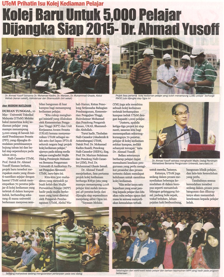 UTeM Prihatin Isu Kolej Kediaman Kolej Baru Untuk 5,000 Pelajar Dijangka Siap 2015 - Dr. Ahmad Yusoff