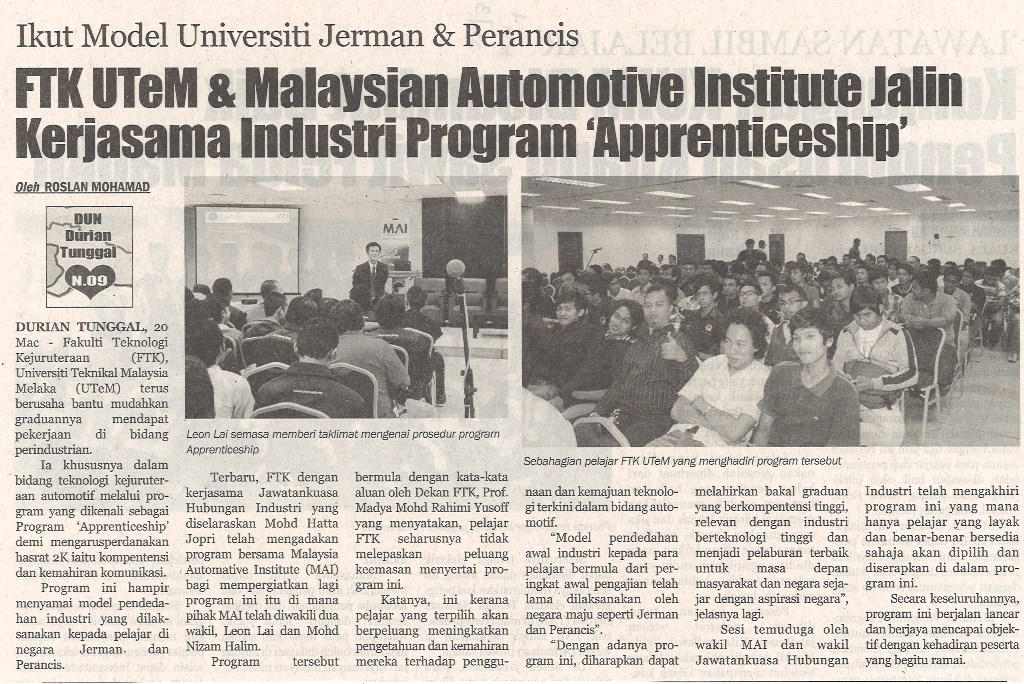 Ikut Model Universiti Jerman & Perancis FTK UTeM & Malaysian Automotive Institute Jalin Kerjasama Industri Program 'Apprenticeship'