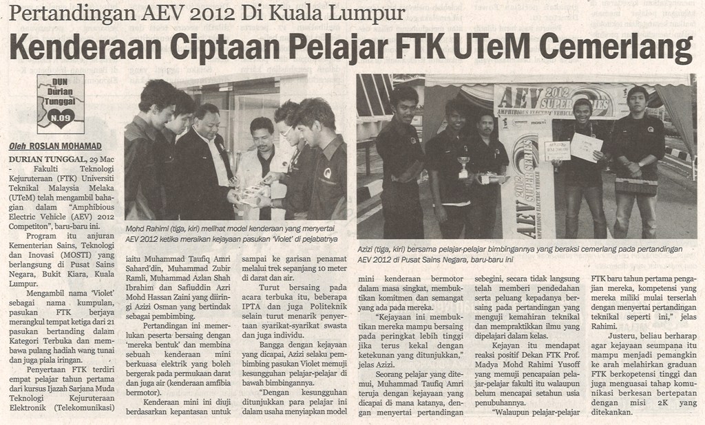Pertandingan AEV 2012 Di Kuala Lumpur Kenderaan Ciptaan Pelajar FTK UTeM Cemerlang