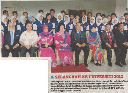 : | Berita Bergambar SELANGKAH KE UNIVERSITI 2012 Yang Dipertua Bakti, Datin Seri Rosmah Mansor (depan, empat dari kiri), Naib Yang Dipertua Bakti, Puan Sri Noorainee (tiga dari kiri) bersama Ketua Menteri Melaka, Datuk Seri Mohd Ali Rustam (empat dari kanan) bersama para pelajar sekolah selepas majlis pelancaran Selangkah Ke Universiti 2012 di UTeM Durian Tunggal, Melaka semalam. |