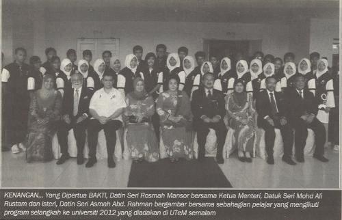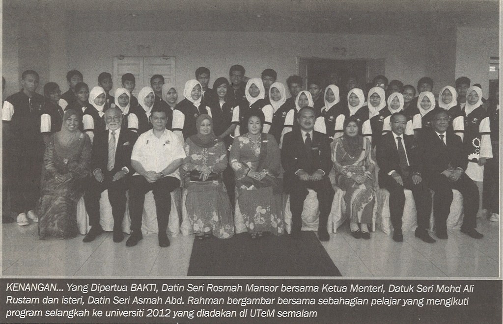 : | Berita Bergambar Kenangan...Yang Dipertua BAKTI, Datin Seri Rosmah Mansor bersama Ketua Menteri, Datuk Seri Mohd Ali Rustam dan isteri, Datin Seri Asmah Abd Rahman bergambar bersama sebahagian pelajar yang mengikuti program selangkah Ke Universiti 2012 yang diadakan di UTeM semalam. |