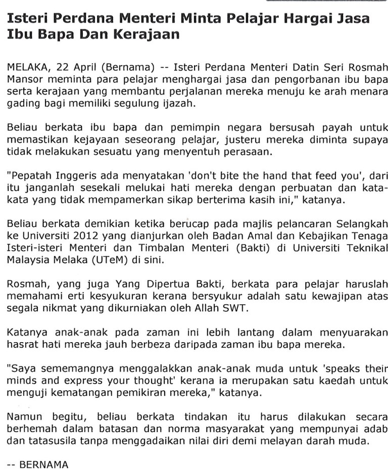 Isteri Perdana Menteri Minta Pelajar Hargai Jasa Ibu Bapa Dan Kerajaan