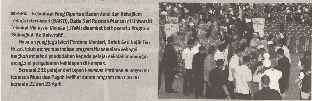 : | Berita Bergambar MESRA...Kehadiran Yang Dipertua Badan Amal dan Kebajikan Tenaga Isteri-Isteri (BAKTI),Datin Seri Rosmah di Universiti Teknikal Malaysia Melaka (UTeM) disambut baik peserta Program 'Selangkah Ke Universiti' Rosmah yang juga isteri Perdana Menteri ,Datuk Seri Najib Tun Razak telah menyempurnakan program itu semalam sebagai langkah memberi pendedahan kepada pelajar sekolah menengah mengenai pengalaman kehidupan di kampus. Seramai 262 pelajar dari lapan kawasan Parlimen di negeri ini termasuk Muar dan Pegoh terlibat dalam program dua hari itu bermula 22 dan 23 April |