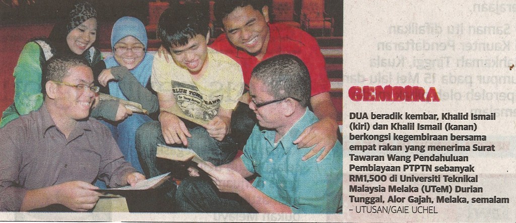 : | Berita Bergambar Dua Beradik Kembar,Kahalid Ismail(kiri) dan Khalil Ismail(kanan) berkongsi kegembiraan bersama empat rakan yang menerima surat tawaran wang pendahuluan pembiayaan PTPTN sebanyak RM1,500 di Universiti Teknikal Malaysia Melaka (UTeM) Durian Tunggal, Alor Gajah, Melaka, semalam |