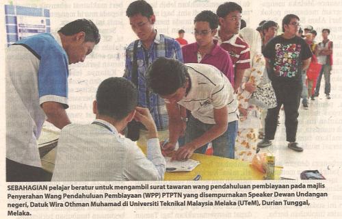 : | Berita Bergambar Sebahagian pelajar beratur untuk mengambil surat tawaran wang pendahuluan pembiayaan pada majlis penyerahan wang pendahuluan pembiayaan (WPP) PTPTN yang disempurnakan Speaker Dewan Undungan Negeri, Datuk Wira Othman Muhamad di Universiti Teknikal Malaysia Melaka (UTeM), Durian Tunggal, Melaka. |