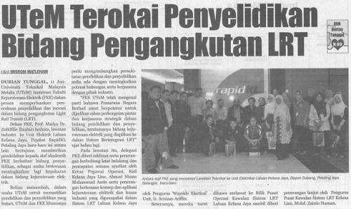 UTeM Terokai Penyelidikan Bidang Pengangkutan LRT