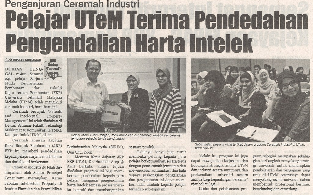 Penganjuran Ceramah Industri Pelajar UTeM Terima Pendedahan Pengendalian Harta Intelek