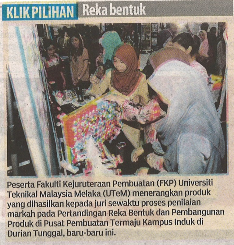 : | Berita Bergambar Peserta Fakulti Kejuruteraan Pembuatan (FKP) Universiti Teknikal Malaysia Melaka (UTeM) menerangkan produk yang dihasilkan kepada juri sewaktu proses penilaian markah dan Pertandingan Reka Bentuk Dan Pembangunan Produk Di Pusat Pembuatan Temaju Kampus Induk di Durian Tunggal, baru-baru ini. |