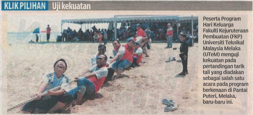 : | Berita Bergambar Uji Kekuatan- Peserta Program Hari Keluarga Fakulti Kejuruteraan Pembuatan (FKP) Universiti Teknikal Malaysia Melaka (UTeM) menguji kekuatan pada pertandingan tarik tali yang diadakan sebagai salah satu acara pada program berkenaan di Pantai Puteri, Melaka, baru- baru ini. |