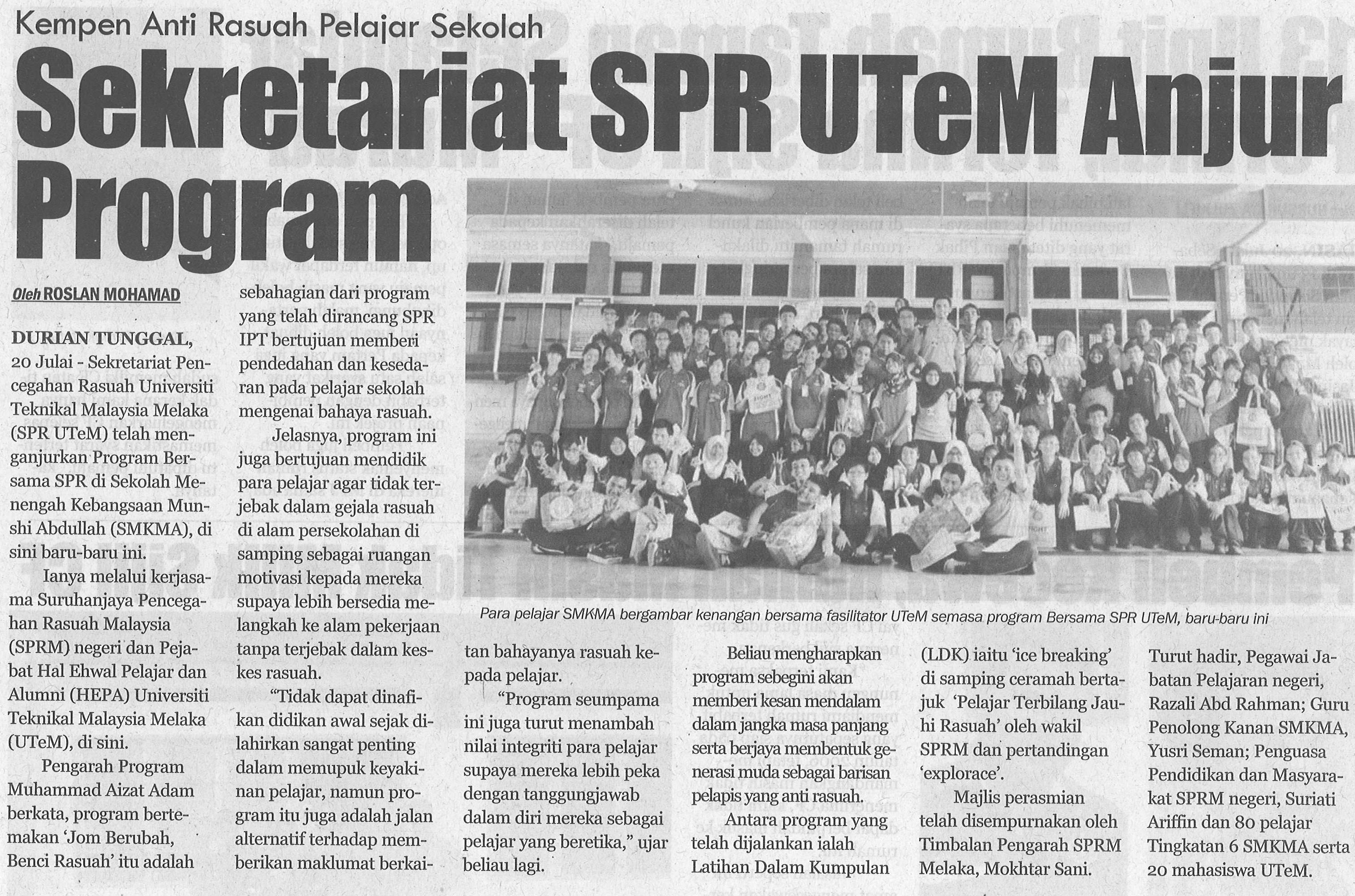 Kempen Anti Rasuah Pelajar Sekolah Sekretariat SPR UTeM Anjur Program
