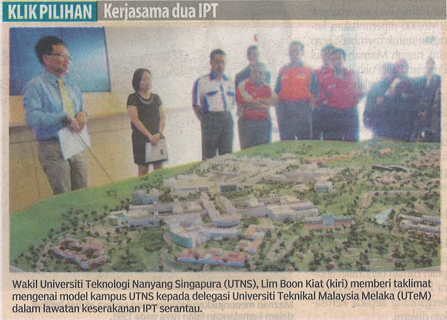 : | Berita Bergambar Kerjasama dua IPT- Wakil Universiti Teknologi Nanyang Singapura (UTNS), Lim Boon Kiat (kiri) memberi taklimat mengenai model kampus UTNS kepada delegasi Universiti Teknikal Malaysia Melaka (UTeM) dalam lawatan keserakanan IPT serantau. |