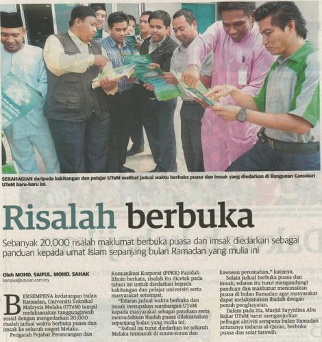 Risalah berbuka Sebanyak 20,000 risalah maklumat berbuka puasa dan imsak diedarkan sebagai panduan kepada umat islam sepanjang Ramadan yang mulia ini
