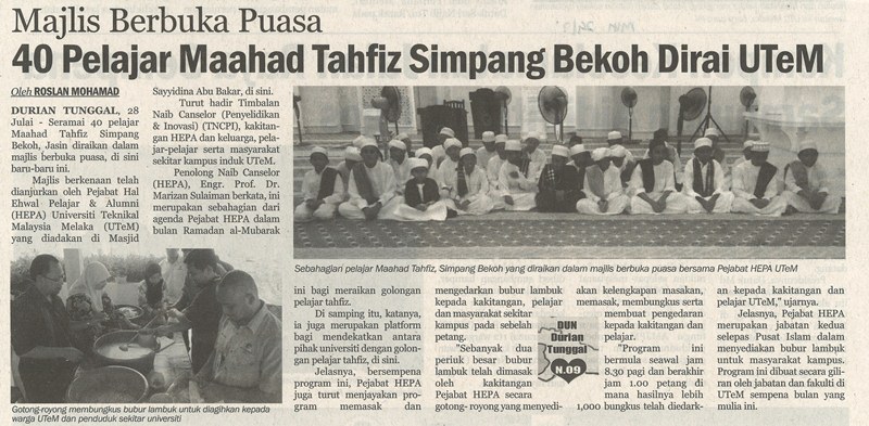Majlis Berbuka Puasa 40 Pelajar Maahad Tahfiz Simpang Bekoh Dirai UTeM