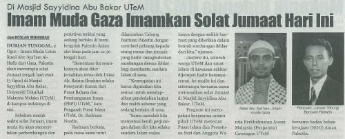 Di Masjid Sayyidina Abu Bakar UTeM Imam Muda Gaza Imamkan Solat Jumaat Hari Ini