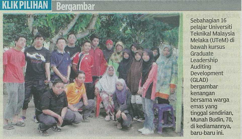 : | Klik Pillihan Bergambar- Sebahagian 16 pelajar Universiti Teknikal Malaysia Melaka (UTeM) di bawah kursus Graduate Leadership Auditing Development (GLAD) bergambar kenangan bersama warga emas yang tinggal sendirian, Munah Bidin, 70, di kediamannya, baru-baru ini. |