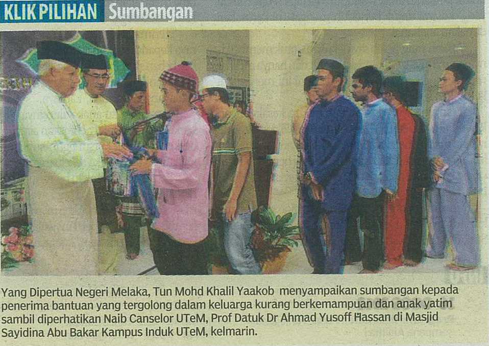 : | Klik Pilihan Sumbangan- Yang Dipertua Negeri Melaka, Tun Mohd. Khalil Yaakob menyampaikan sumbangan kepada penerima bantuan yang tergolong dalam keluarga kurang berkemampuan dan anak yatim sambil diperhatikan Naib Canselor UTeM, Prof. Datuk Dr. Ahmad Yusoff Hassan di Masjid Saiyidina Abu Bakar Kampus Induk UTeM, kelmarin. |