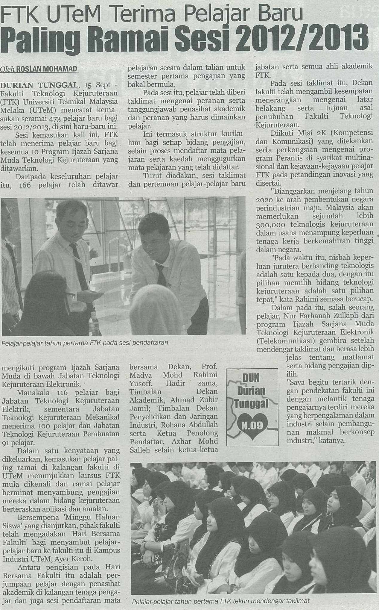 FTK UTeM Terima Ramai Pelajar Baru Paling Ramai Sesi 2012/2013