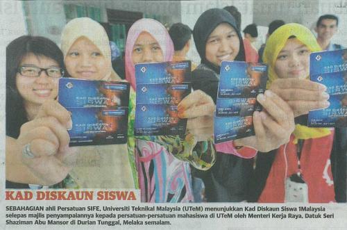 : | Berita Bergambar- Kad Diskaun Siswa, Sebahagian ahli Persatuan SIFE, Universiti Teknikal Malaysia Melaka (UTeM) menunjukkan Kad Diskaun Siswa 1Malaysia selepas penyampaiannya kepada persatuan-persatuan mahasiswa di UTeM oelh Menteri Kerja Raya, Datuk Seri Shaziman Abu Mansor di Durian Tunggal, Melaka semalam. |