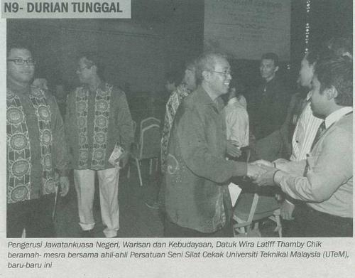 Berita Bergambar- Pengerusi Jawatankuasa Negeri, Warisan dan Kebudayaan, Datuk Wira Latiff Thamby Chik beramah mesra bersama Persatuan Seni Silat Cekak Universiti Teknikal Malaysia Melaka (UTeM), baru-baru ini.