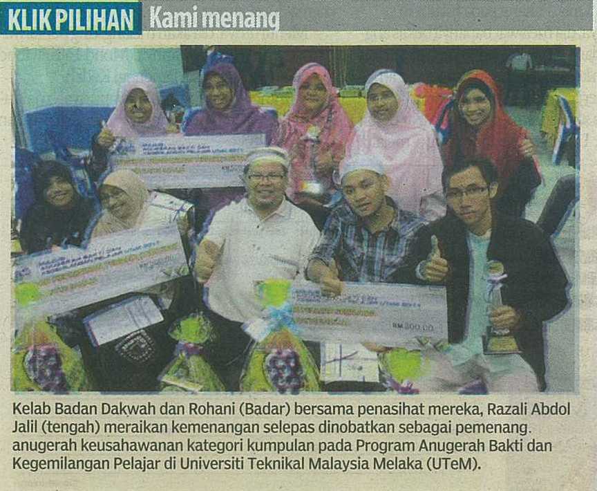 : | Berita Bergambar- Kami menang, Kelab Badan Dakwah dan Rohani (Badar) bersama penasihat mereka, Razali Abdol Jalil (tengah) meraikan kemenangan selepas dinobatkan sebagai pemenang anugerah keusahawanan kategori kumpulan pada Program Anugerah Bakti dan Kegemilangan Pelajar di Universiti Teknikal Malaysia Melaka (UTeM). |