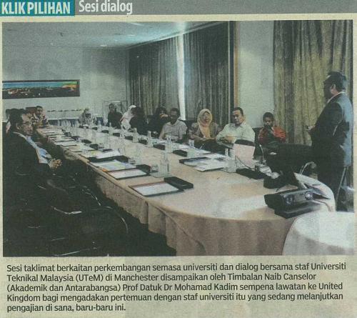 : | Klik Pilihan, Sesi Dialog- Sesi taklimat berkaitan perkembangan semasa universiti dan dialog bersama staf Universiti Teknikal Malaysia Melaka (UTeM) di Manchester disampaikan oleh Timbalan Naib Canselor (Akademik dan Antarabangsa) Prof. Datuk Dr. Mohamad Kadim sempena lawatan ke United Kingdom bagi mengadakan pertemuan dengan staf universiti itu yang sedang melanjutkan pengajian di sana, baru-baru ini. |