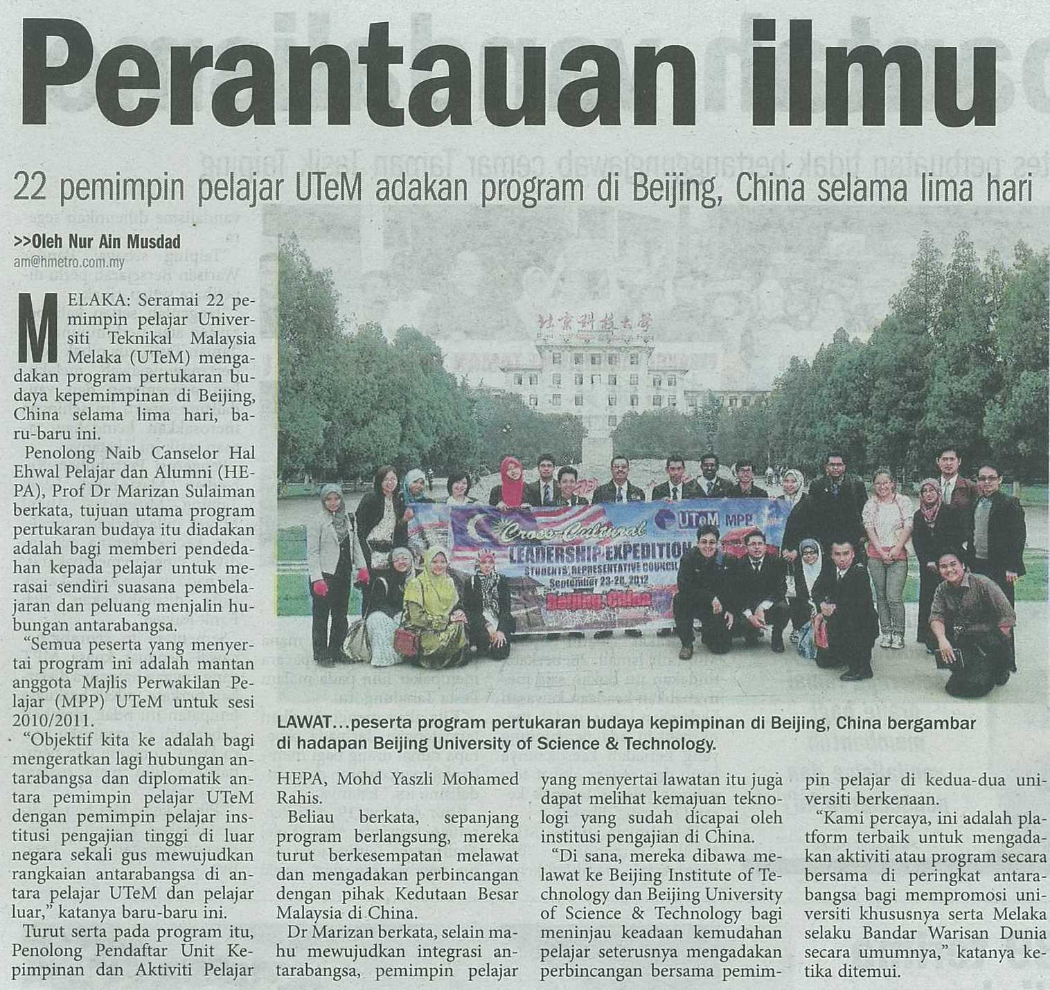 Perantauan ilmu, 22 pemimpin pelajar UTeM adakan program di Beijing, China selama lima hari