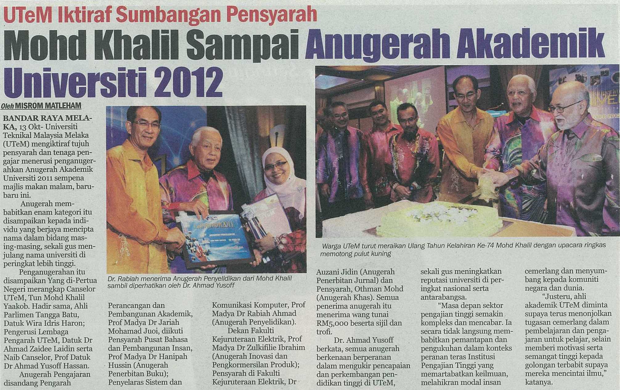 UTeM Iktiraf Sumbangan Pensyarah Mohd Khalil Sampai Anugerah Akademik Universiti 2012