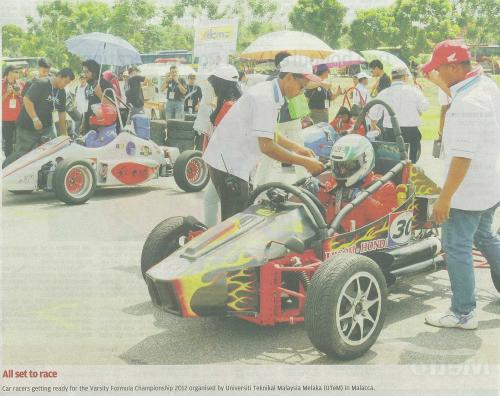 All set to race, car racers getting ready for the Formula Varsity Championship 2012 organised by Universiti Teknikal Malaysia Melaka (UTeM) in Malacca.