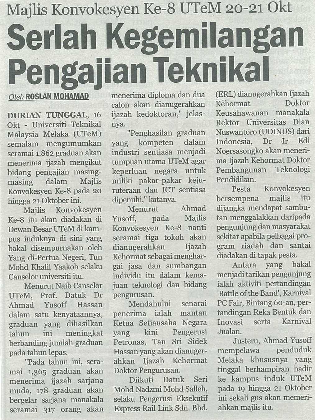 Majlis Konvokesyen Ke-8 UTeM 20-21 Okt Serlah Kegemilangan Pengajian Teknikal