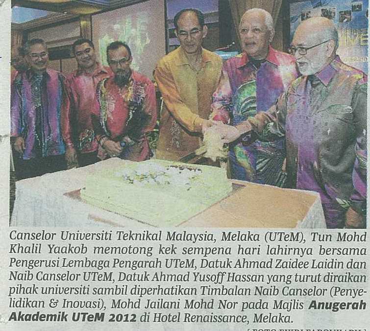 : | Berita Bergambar- Canselor Universiti Teknikal Malaysia Melaka (UTeM), Tun Mohd Khalil Yaakob memotong kek sempena hari lahirnya bersama Pengerusi Lembaga Pengarah UTeM, Datuk Ahmad Zaidee Laidin dan Naib Canselor UTeM, Datuk Ahmad Yusoff Hassan yang turut diraikan pihak universiti sambil diperhatikan Timbalan Naib Canselor (Penyelidikan & Inovasi), Mohd Jailani Mohd Nor pada Majlis Anugerah Akademik UTeM 2012 di Hotel Renaissance, Melaka. |