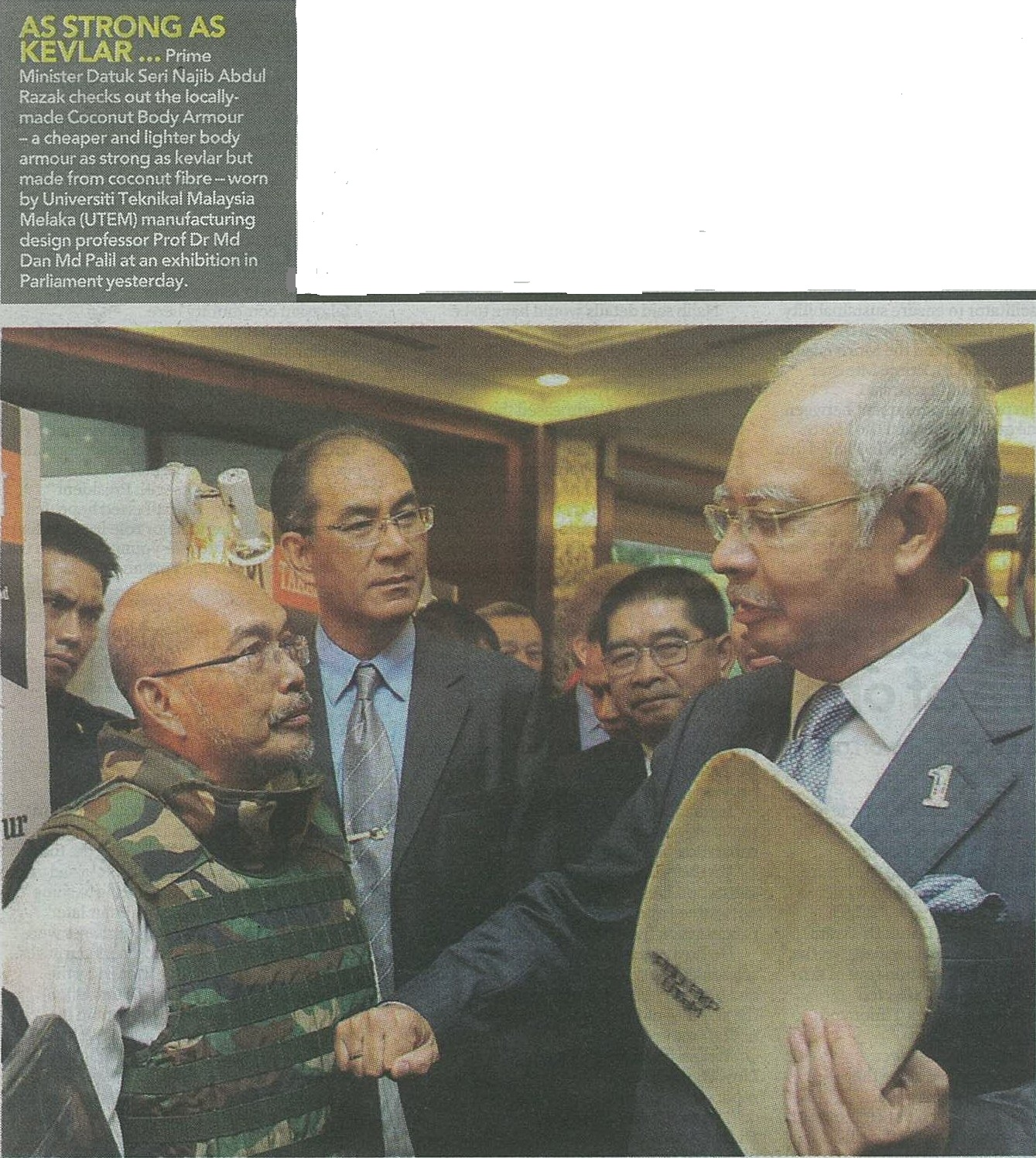 : | AS STRONG AS KEVLAR... Prime Minister Datuk Seri Najib Abdul Razak checks out the locally-made Coconut Body Armour- a cheaper and lighter body armour as strong as kevlar but made from coconut fibre- worn by Universiti Teknikal Malaysia Melaka (UTeM) manufacturing design professor Prof. Dr. Md. Dan Md. Palil at an exhibition in Parliament yesterday. |