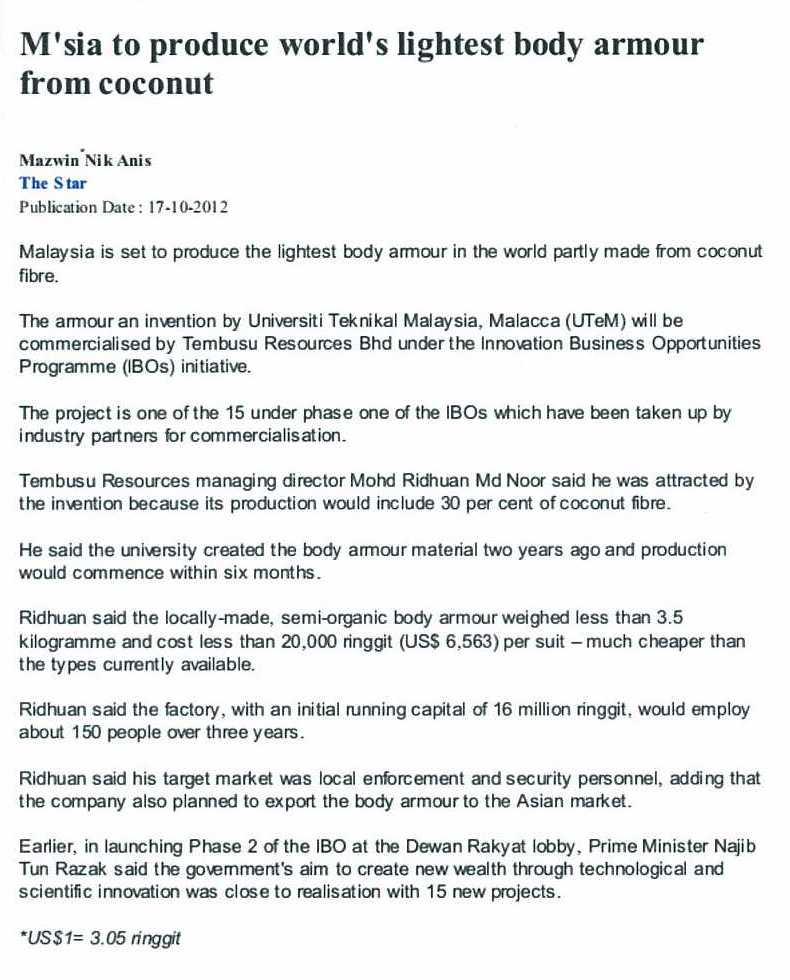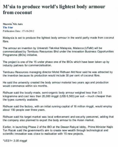 M'sia to produce world's lightest body armour from coconut