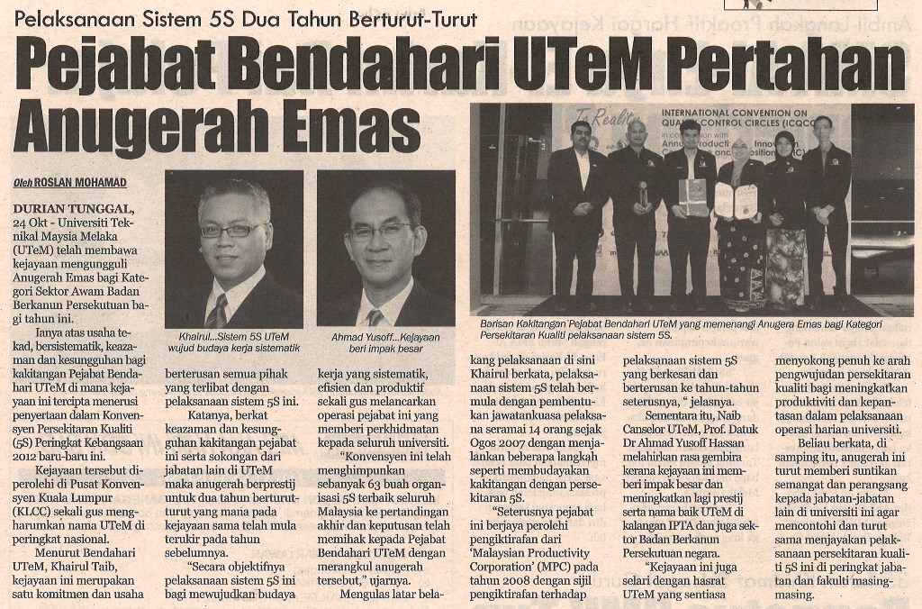 Pelaksanaan Sistem 5S Dua Tahun Berturut-Turut Pejabat Bendahari UTeM Pertahan Anugerah Emas
