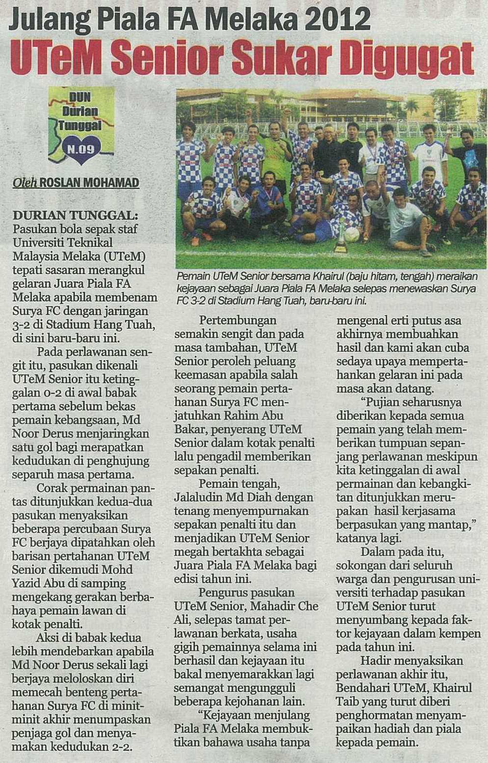 Julang Piala FA Melaka 2012 UTeM senior Sukar Digugat