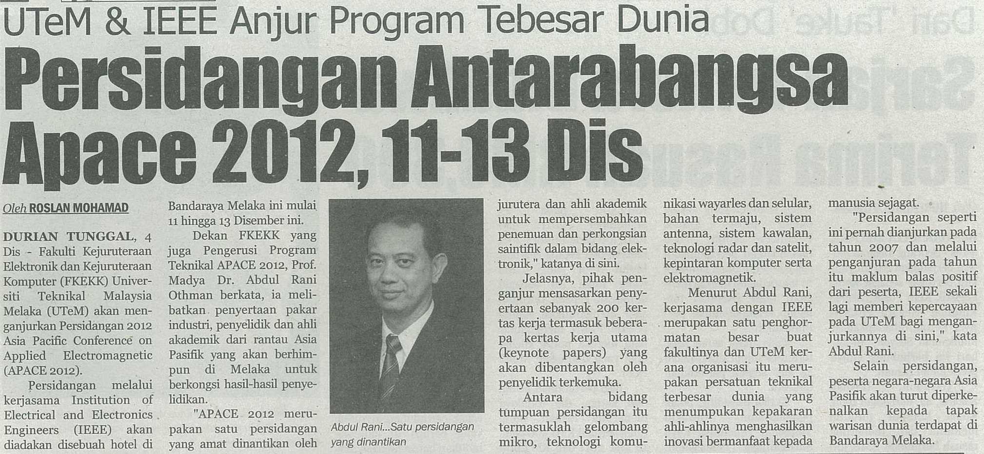 UTeM & IEEE Anjur Program Terbesar Dunia Persidangan Antarabangsa Apace 2012, 11-13 Dis