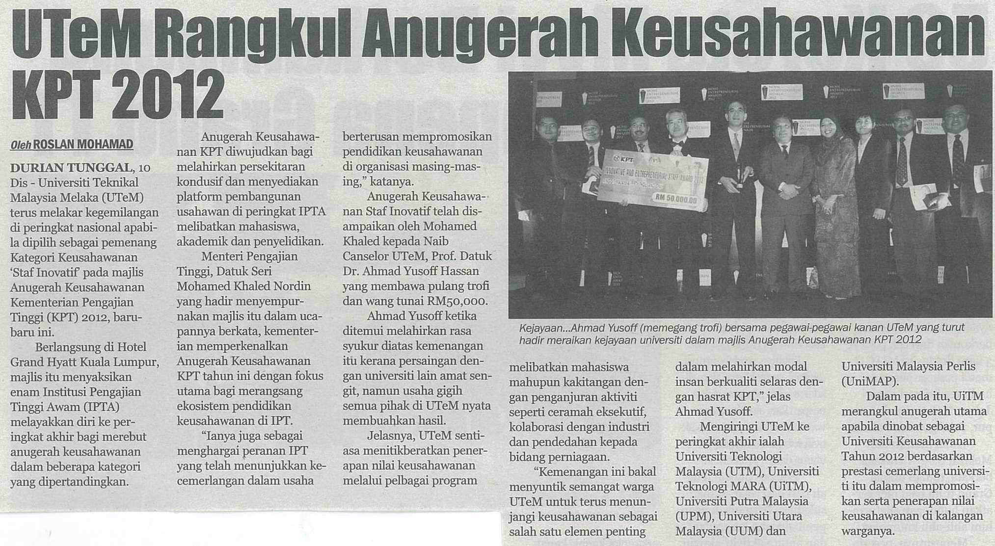 UTeM Rangkul Anugerah Keusahawanan KPT 2012