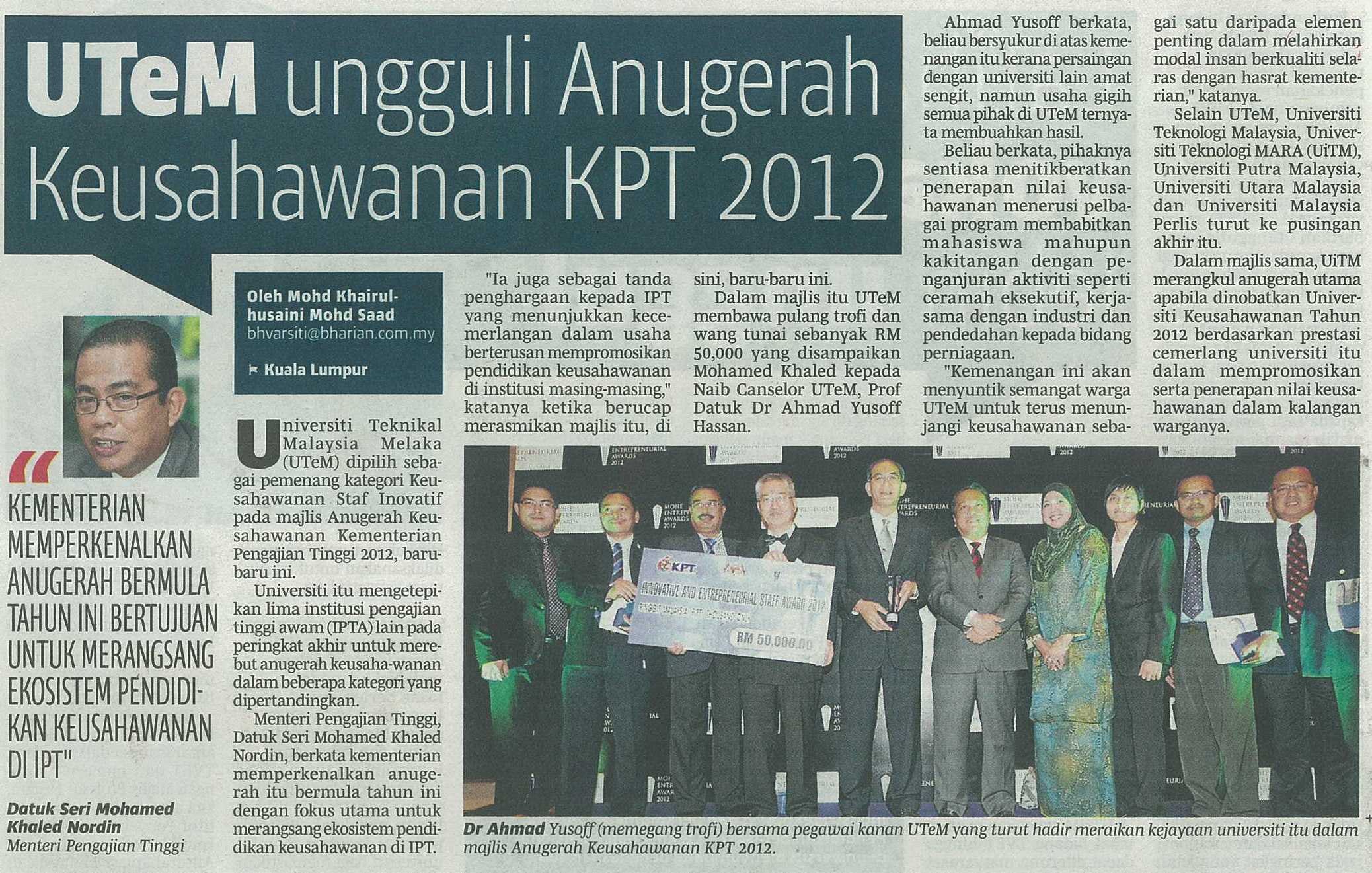 UTeM ungguli Anugerah Keusahawanan KPT 2012