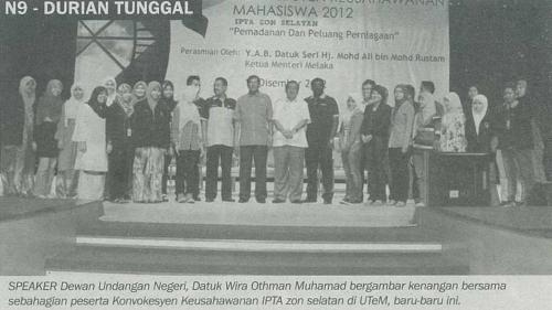 Berita Bergambar- SPEAKER Dewan Undangan Negeri, Datuk Wira Othman Muhamad bergambar kenangan bersama sebahagian peserta Konvokesyen Keusahawanan IPTA zon selatan di UTeM, baru-baru ini.